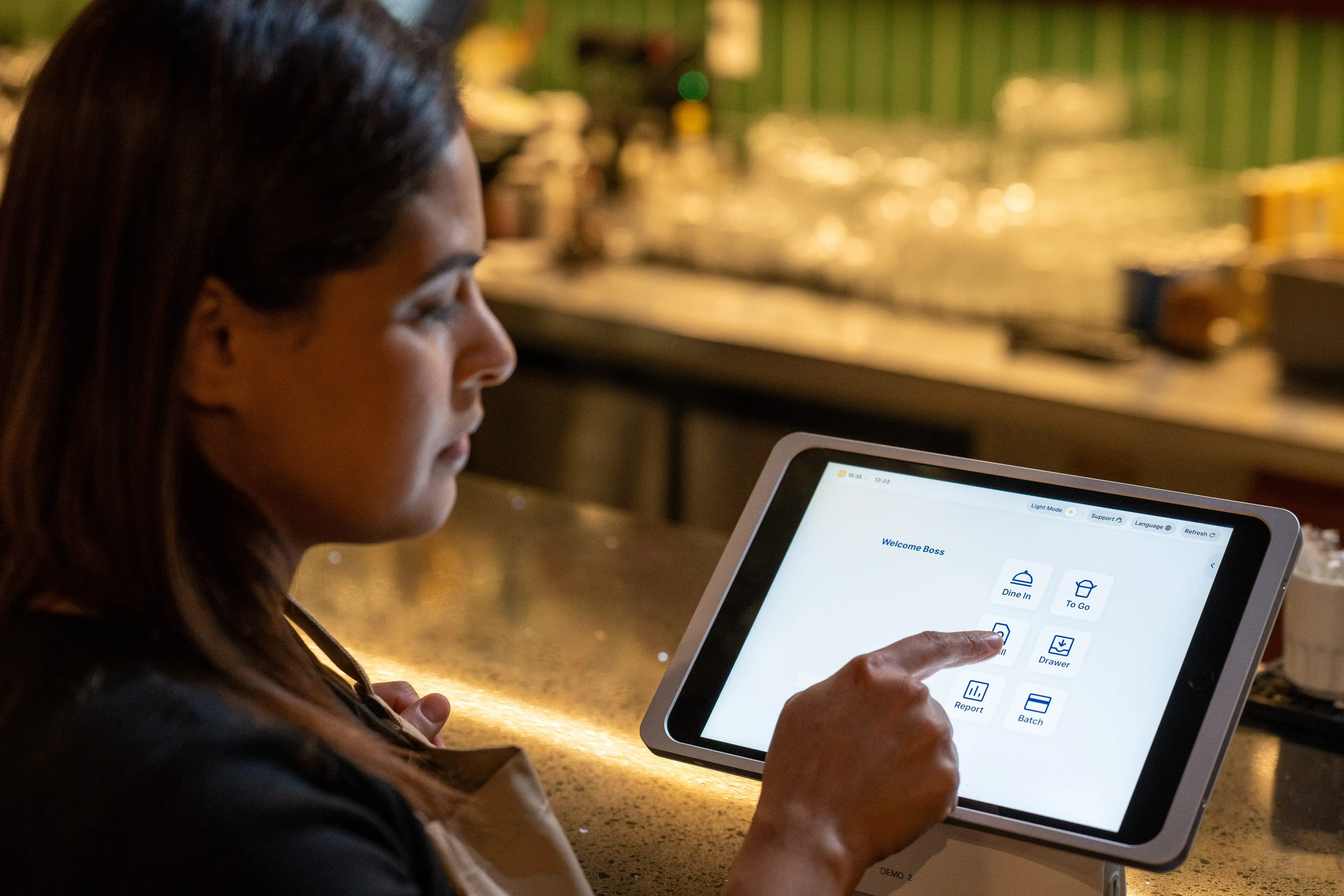 • Order entry and check management: add items, split checks, apply discounts, send to kitchen